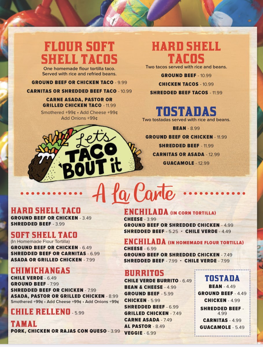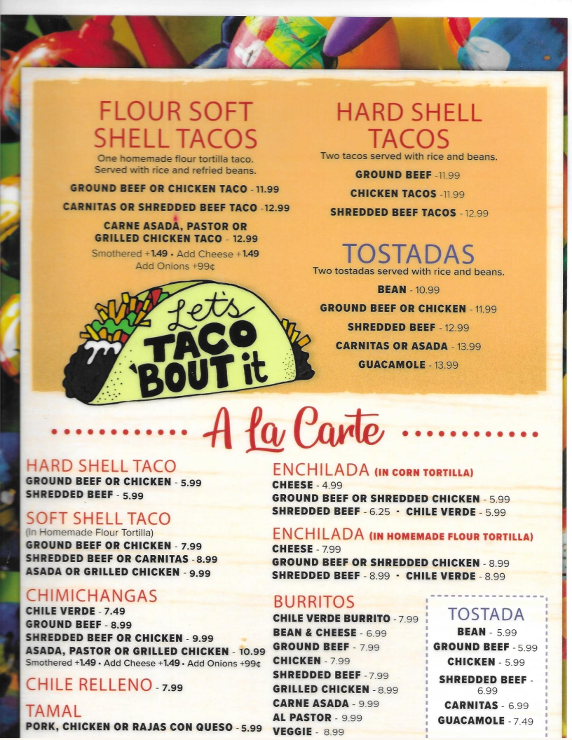 One homemade flour tortilla taco. Served with rice and refried beans.